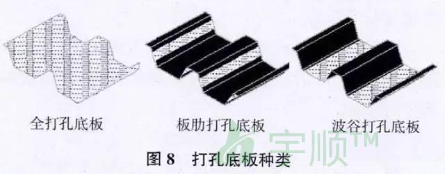 解決辦法:屋面底板穿孔+鋪設吸聲材料(無紡吸聲布及玻璃纖維棉),打孔底板種類見圖8。